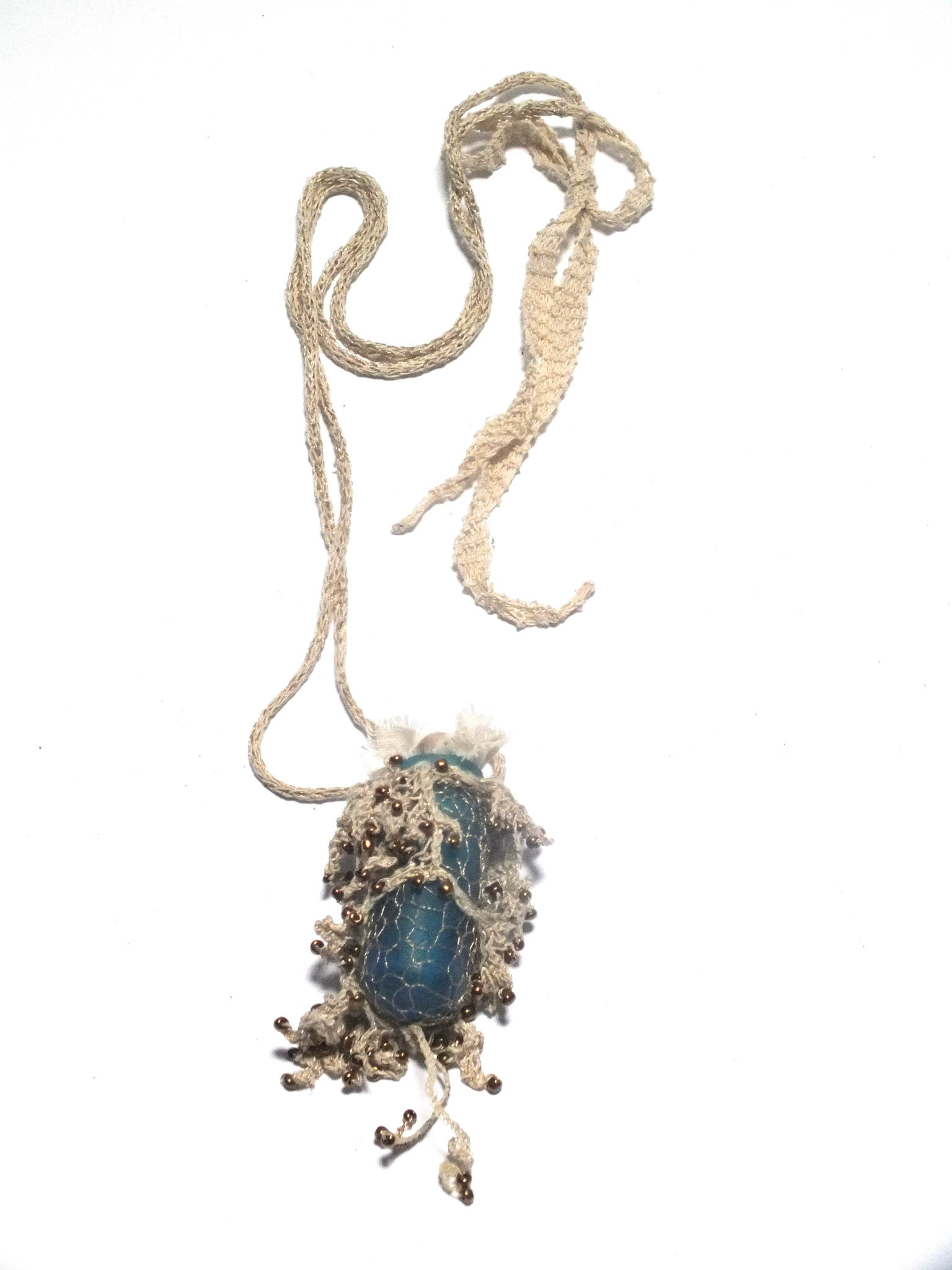 Pâte de cristal bleu et translucide, fil de soie de 2 teintes d'ocre et coton noir et rouge, médaille d'argent